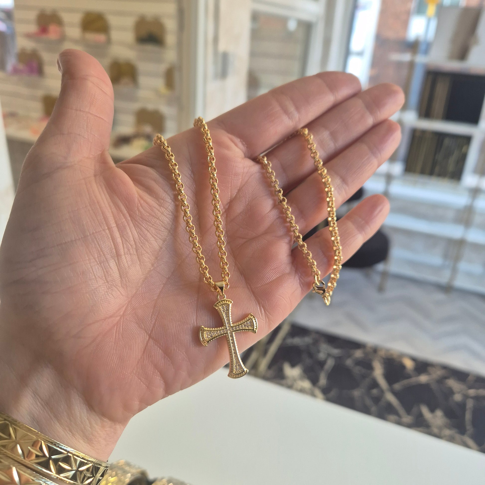 Radiant and divine, our cross Pendant is a true statement of elegance. Set with sparkling white CZ stones, this piece shines beautifully against its luxurious 6mm full patterned belcher chain, finished in premium 14k gold plating.