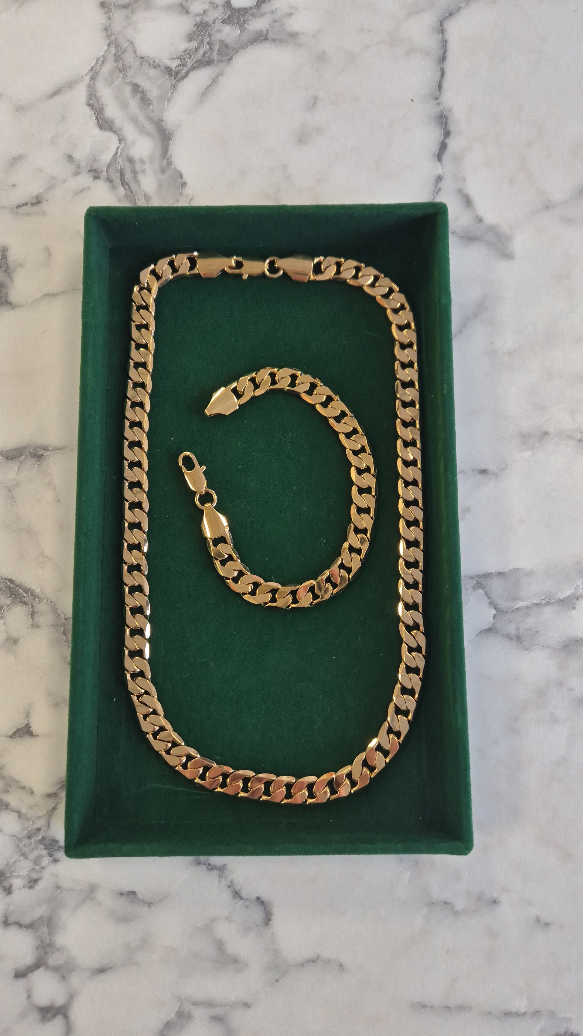 Mens 18k gold plated curb set featuring a 20β chain and 8β matching bracelet.