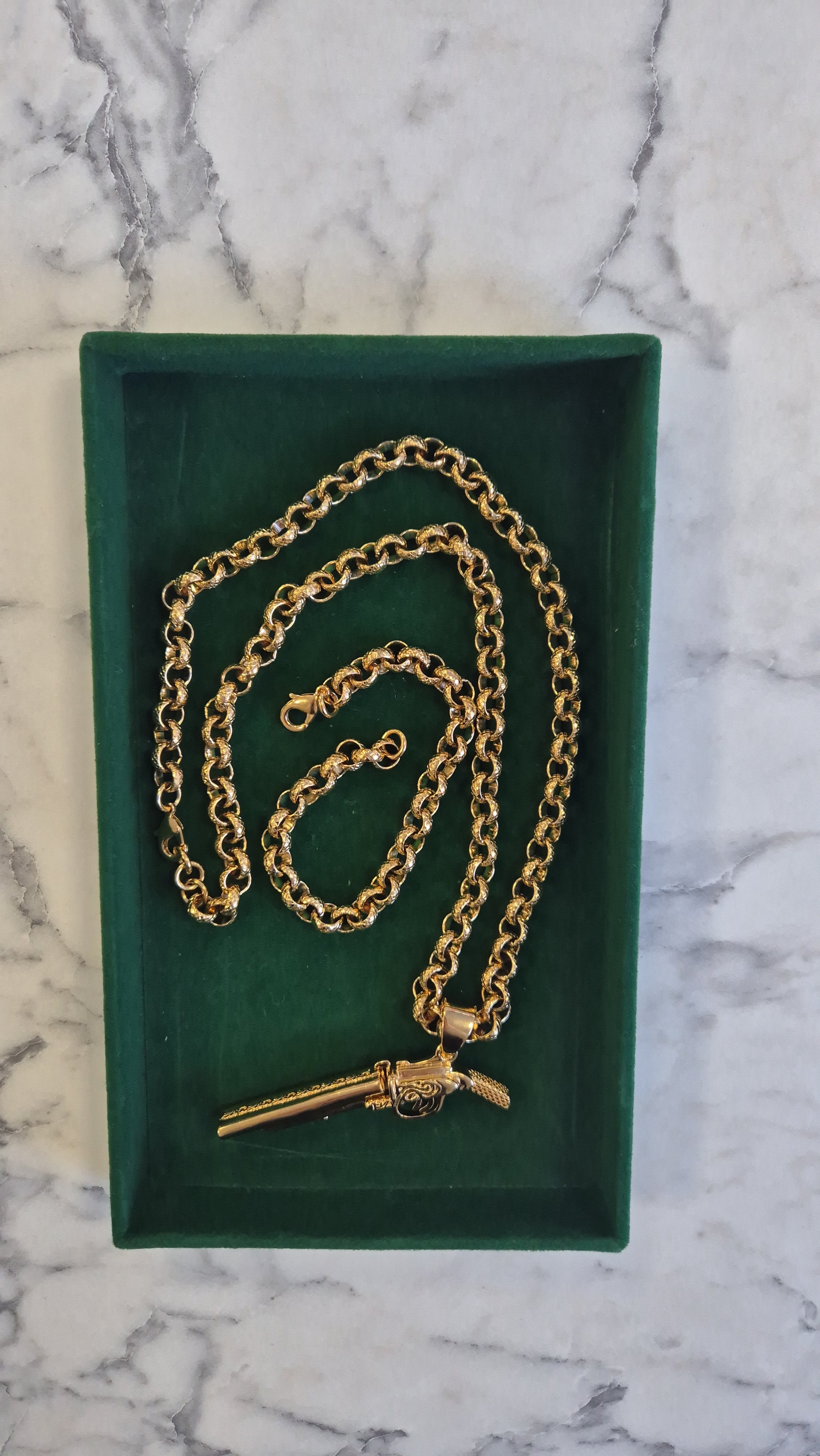 Large full patterned shotgun pendant that opens up, paired with an 8mm 24" full patterned belcher chain and a matching 8mm 8" belcher bracelet.