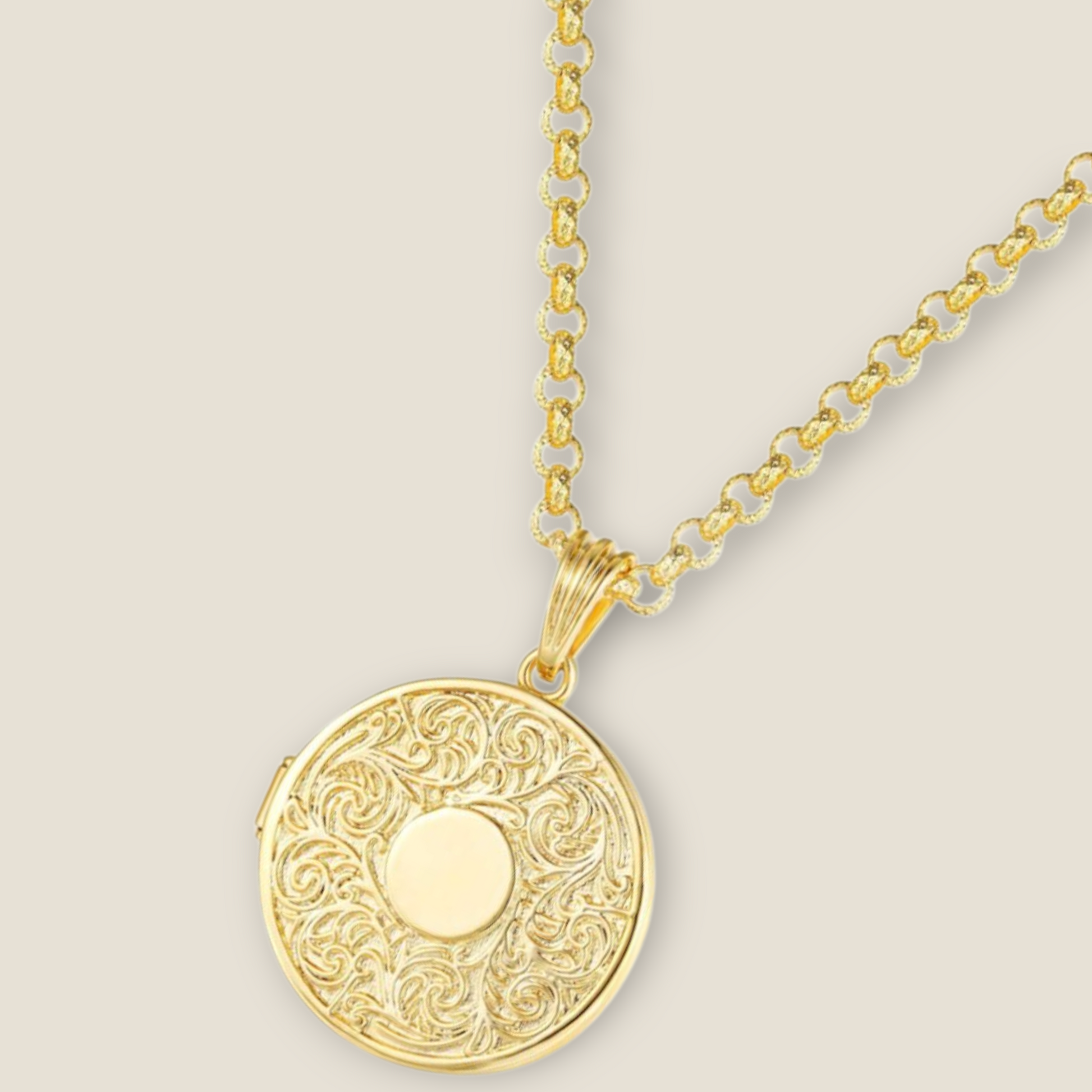 Keep your most precious memories close to your heart with this beautifully crafted large round ornate locket. Designed with elegant, vintage-style detailing and a smooth polished finish, this standout piece opens to hold a photo or small keepsake inside. Made for sentiment and style, it’s paired with a classic 4mm belcher chain and available in 18", 20", or 22" lengths, so you can choose your perfect fit.