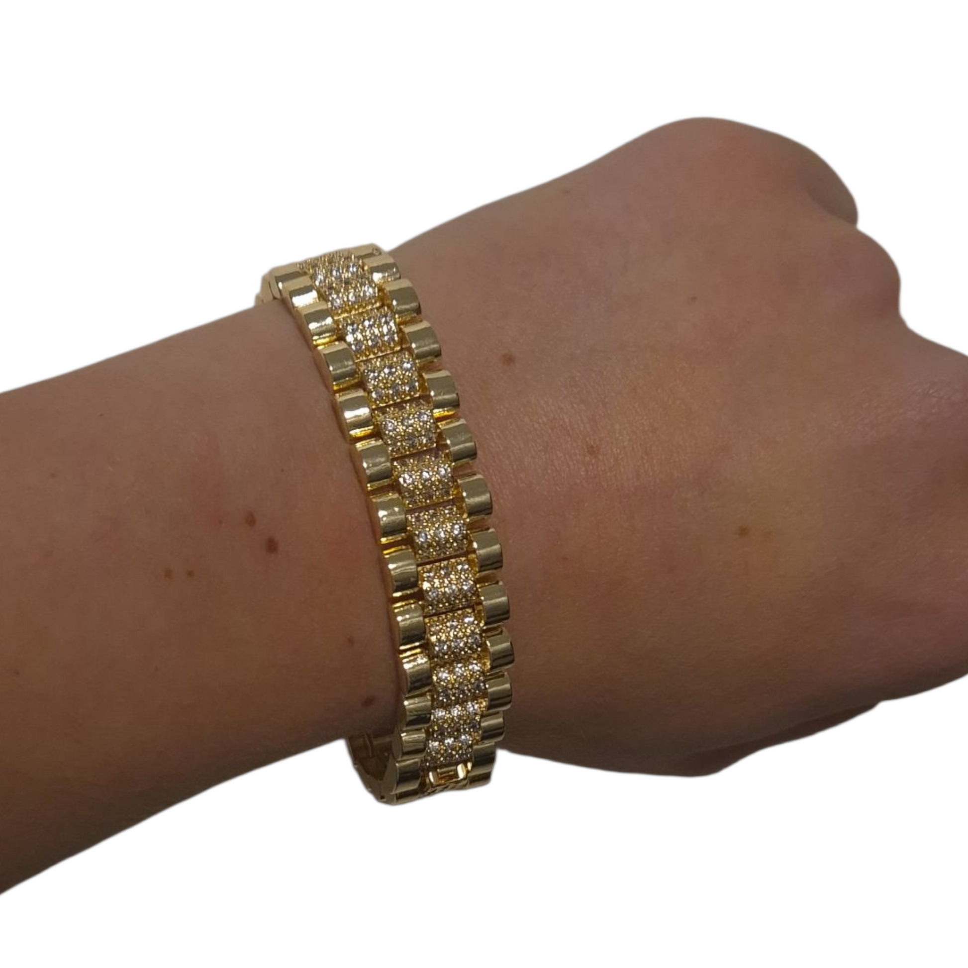 A stunning, luxury-inspired bracelet with sparkling CZ stones set along a sleek watch-style strap. Elegant, timeless, and a guaranteed statement piece.